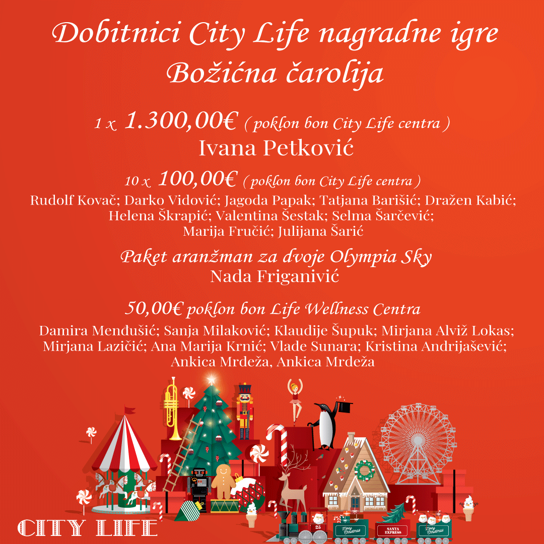 Zahvaljujemo svima koji su sudjelovali u našoj velikoj nagradnoj igri Božićna čarolija i svojim shoppingom uljepšali blagdansko vrijeme u City Life centru. Podsjećamo, sudjelovanje je bilo moguće uz kupnju iznad 10 €, ispunjavanjem kupona i ubacivanjem u nagradnu kutiju, a sreća je ovoga puta bila na strani najbržih i najsretnijih.