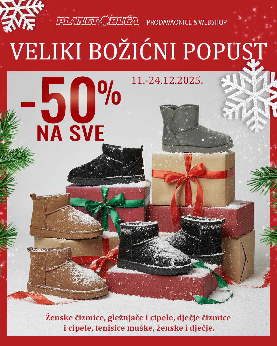 Ne propustite priliku za obnovu vaše kolekcije obuće uz ovaj spektakularni popust, dostupan od 11. do 24. prosinca 2025. u svim prodavaonicama unutar Planet obuća grupacije,
